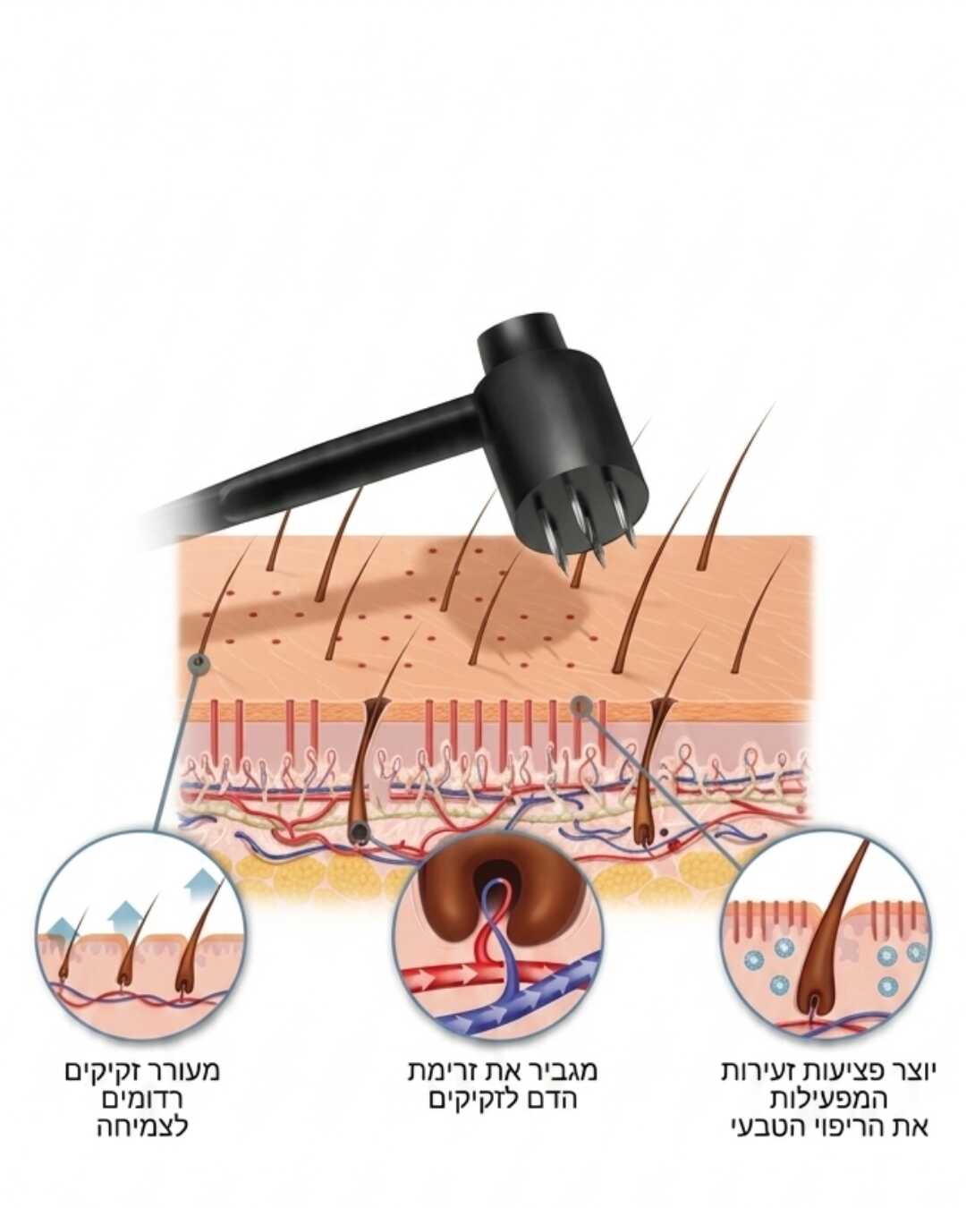 מעורר זקיקים רדומים: ההקשה הקצבית מעוררת את השורש ומעודדת יצירת תאים חדשים.